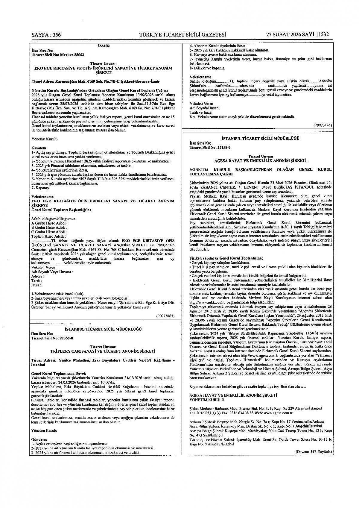 2025 YILI OLAĞAN GENEL KURULU SİCİL GAZETE İLANI EKTEDİR